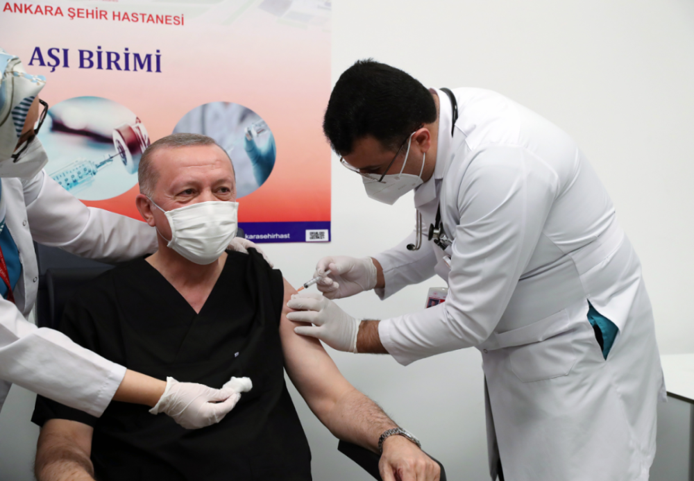 ↑1月14日,土耳其总统埃尔多安在安卡拉一家医院接种中国科兴公司研发的新冠疫苗。