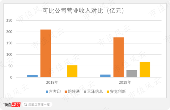 从上图可以看到,厦门吉客印的营业收入规模,在四家公司中,是最小的。2019年,跨境通实现营业收入175.88亿元,大约是跨境通营收规模的15倍。