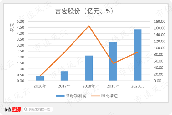 2019年,吉宏股份实现净利润3.26亿元;2016-2019年期间的净利润复合增长率高达96.51%。2020年前三季度的净利润,也是超过了2019年全年的利润规模,实现4.33亿元。