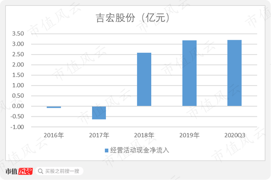 此外,吉宏股份的现金流也在2018年突然大幅好转,一转2016-2017年期间的持续流出状态。