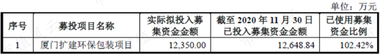 因为在一年以后,2020年12月,上述的三个募投项目中,只有厦门扩建环保包装项目完成了全部的资金投入,而剩余两个项目的投资规模只有原计划的三分之一左右。