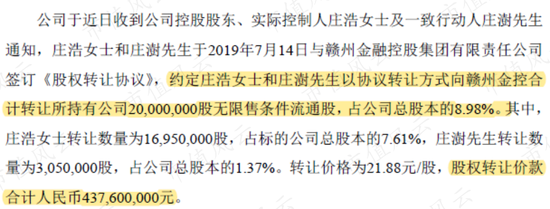 在这份公告中,庄老板及其一致行动人庄澍,计划向赣州金控转让公司8.98%股权。按照21.88元/股的转让价格计算,两人这一把就套现了4.38亿元。