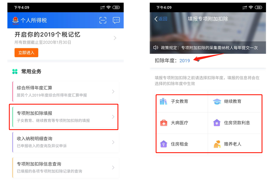 如果你2020年度存在符合条件但未及时填报的专项附加扣除,点击首页【专项附加扣除填报】,选择扣除年度【2020】年。