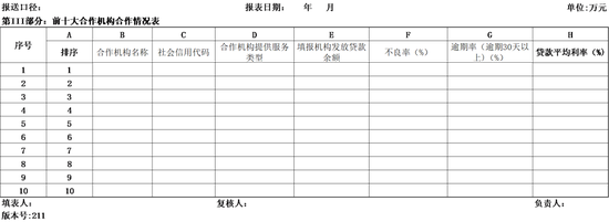 本部分用于统计填报机构与合作机构合作情况,即在填报机构出资比例为100%的互联网贷款业务中,接受合作机构提供营销获客、客户筛选、部分风险评价服务业务情况。本表仅填写在前述情况下,按照互联网贷款业务余额从高至低,前十大合作机构相关情况。若合作机构不足10家,按实际家数填写,剩余部分填0。