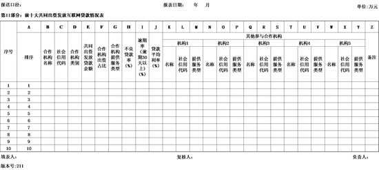 本部分用于统计填报机构与有贷款资质机构共同出资发放互联网贷款情况表。本表填写按照共同出资发放贷款余额(填报机构与合作方出资发放贷款余额总和)从高至低前十大合作机构相关情况。若共同出资发放贷款合作机构不足10家,按实际家数填写,剩余部分填0。