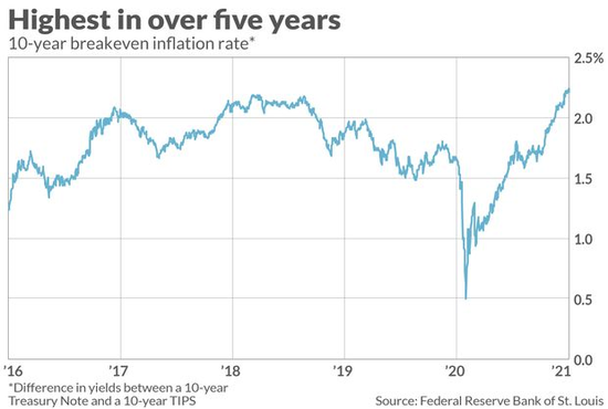 如果通货膨胀对股市构成威胁,我们应该感到害怕。这是因为最近几周通胀预期急剧上升,10年的盈亏平衡通胀率比5年来都要高。