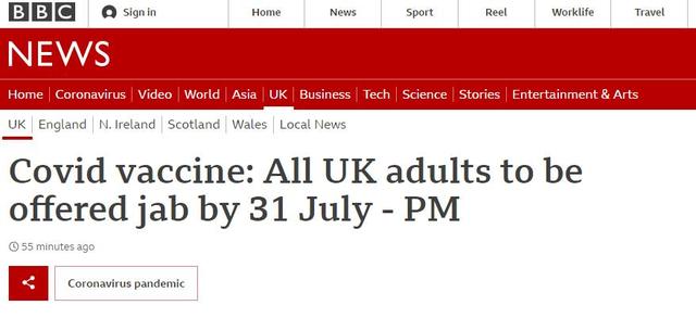 BBC:英首相称,7月31日前,向英国所有成年人提供新冠疫苗
