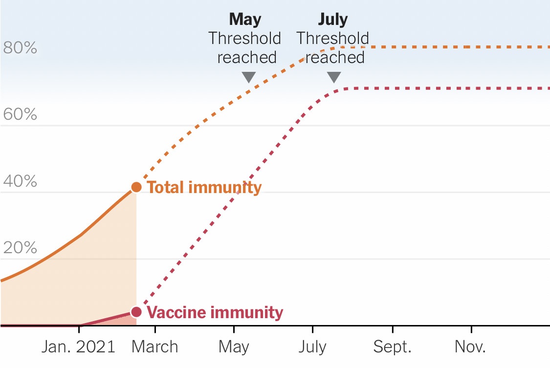 根据公共卫生信息学、计算与运营研究小组(PHICOR)布鲁斯·李(Bruce Lee)等研究人员在《美国预防医学杂志》上发表的一项研究模型,假定疫苗可以预防感染,而不仅仅是降低新冠病毒症状性的严重疾病,那么在目前的条件下,美国最早可能在7月份达到群体免疫70%的最低门槛。
