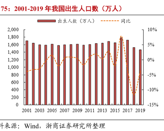 2016年,中国开始实行“全面二孩”政策,这一年出生人口创下2000年来的峰值,达1786 万 ,增长7.9%。短暂的上升后便是一路下滑,2017、2018、2019年分别降低3.5%、11.6%、3.8%。