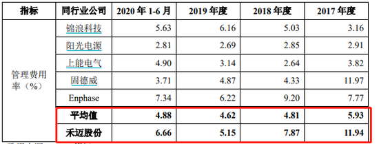 一般来说,管理费用率一定程度上反映了企业经营管理的水平。报告期内,禾迈股份管理费用率虽已有下滑趋势,但与可比公司相比仍处于较高水平。2017年—2020年上半年,禾迈股份管理费用率分别为11.94%、7.87%、5.15%和6.66%,同期可比公司平均管理费用率分别为5.93%、4.81%、4.62%和4.88%。