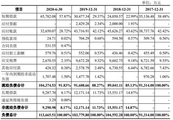 2017年-2019年及2020年上半年,达嘉维康负债总计分别为9.13亿元、10.46亿元、10.38亿元、11.37亿元,流动负债合计分别为9.13亿元、8.90亿元、9.16亿元、10.44亿元,占总负债的比例分别为100.00%、85.13%、88.27%、91.83%。