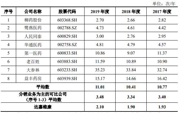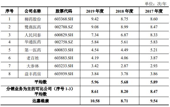 2017年-2019年,达嘉维康存货周转率分别为9.54、8.71、10.58;同行业可比上市公司的)存货周转率平均数分别为5.89、5.68、5.96;分销业务为主的可比公司(柳药股份、鹭燕医药、人民同泰)存货周转率平均数分别为8.47、8.20、8.61。