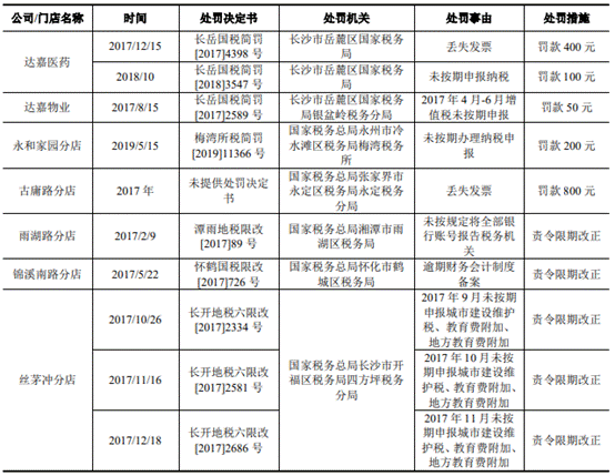 2017年5月22日,国家税务总局怀化市鹤城区税务局下发怀鹤国税限改[2017]726 号,对达嘉维康锦溪南路分店责令限期改正,处罚事由为逾期财务会计制度备案。