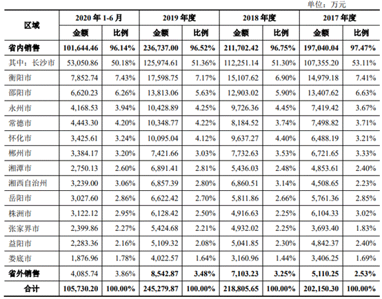 公司主营业务收入主要在湖南省内实现。2017年-2019年及2020年上半年,达嘉维康来自湖南省的主营业务收入占比分别达97.47%、96.75%、96.52%、96.14%。
