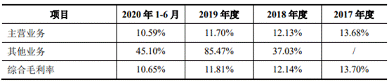 2017年-2019年及2020年上半年,达嘉维康综合毛利率分别为13.70%、12.14%、11.81%及10.65%,连降2年半。
