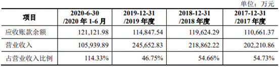2017年-2019年及2020年上半年,达嘉维康应收账款余额分别为11.07亿元、11.96亿元、11.48亿元、12.11亿元,占营业收入比例分别为54.73%、54.66%、46.75%、114.33%。