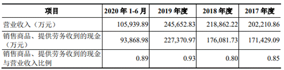 2017年-2019年及2020年上半年,达嘉维康营业收入分别为20.22亿元、21.89亿元、24.57亿元及10.59亿元,销售商品、提供劳务收到的现金分别为17.14亿元、17.61亿元、22.74亿元、9.39亿元,销售商品、提供劳务收到的现金与营业收入比例分别为0.85、0.80、0.93、0.89。