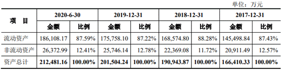 2017年-2019年及2020年上半年,达嘉维康资产总计分别为16.64亿元、19.09亿元、20.15亿元、21.25亿元,其中流动资产分别为14.55亿元、16.86亿元、17.58亿元、18.61亿元,占总资产的比例分别为87.43%、88.28%、87.22%、87.59%。