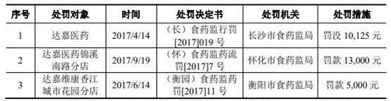 据达嘉维康招股书,达嘉维康最近三年内受到14起行政处罚,其中药监局行政处罚3起、卫计局处罚1起、税务局处罚10起。其中长沙市食品药品监督管理局于2017年4月14日对达嘉维康的全资子公司达嘉医药的处罚系因其销售劣药。
