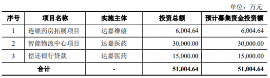 达嘉维康拟在深交所创业板公开发行新股不超过5162.64万股,占发行后总股本的比例不低于25%,拟募集资金净额为5.10亿元,其中6004.64万元用于“连锁药房拓展项目”,3亿元用于“智能物流中心项目”、1.50亿元用于“偿还银行贷款”。达嘉维康本次发行的保荐机构是国金证券。