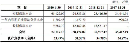 2017年-2019年及2020年上半年各年末,达嘉维康银行借款本金余额分别为3.54亿元、3.90亿元、3.85亿元、7.21亿元。其中短期借款本金分别为3.44亿元、2.34亿元、2.48亿元、6.11亿元,一年内到期的非流动负债本金分别为970.28万元、元、1477.70万元、1707.48万元,长期借款本金分别为元、1.56亿元、1.22亿元、0.93亿元。