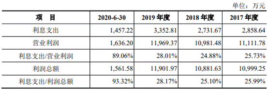 各期,公司利息支出分别为2858.64万元、2731.67万元、3352.81万元、1457.22万元。各期,公司利息支出占利润总额的比例分别为25.99%、25.10%、28.17%、93.32%。