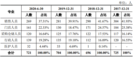 达嘉维康销售人员、门店人员均呈减少趋势,但采购仓储人员和行政人员呈增长趋势。
