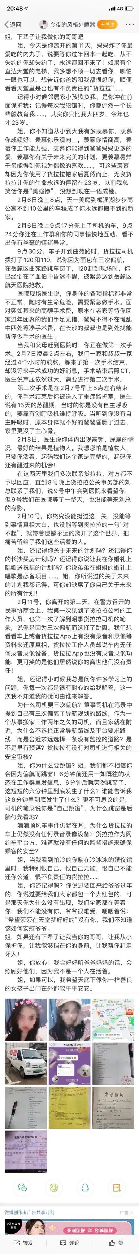 他在微博推文中质疑道,肇事司机在笔录中提到自己有三次偏离了导航规划的路线,作为一个从事搬家工作两年之久的司机,家就在附近,为什么不选择正常导航路线及平台要求路线,而是舍近求远选择一条没有监控的道路?是不是早有预谋?货拉拉有没有对司机进行相关的安全审核?