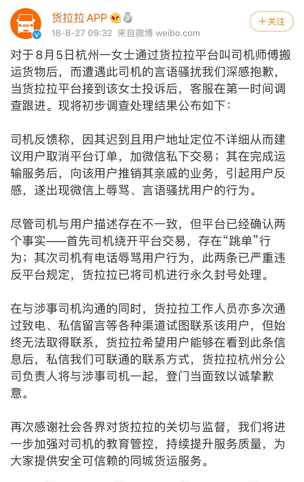 直到女孩投诉平台的半个月后,货拉拉才出了一个声明,称已经对这位司机进行封号处理。