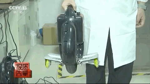 然而在检测过程中,这台标称为“嗨车族”牌的自平衡电动车,被拎起来过了五秒钟后,车轮仍然一直在快速转动。