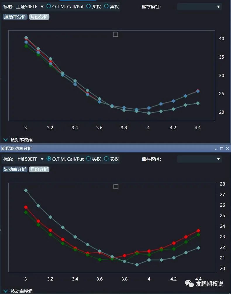 进步看波动率曲线的变化,今天指数大跌下,认沽期权的隐波不仅未因恐慌大涨,反而认购期权隐波因博反弹的“习惯”有所上升。期权人精们总是觉得大跌后会反弹,造成波动率曲线逆时针旋转(下图为咏春大师50ETF3月与6月期权的今昨收盘波动率曲线对比其中上3月下6月,彩色曲线今日蓝色曲线昨日)。