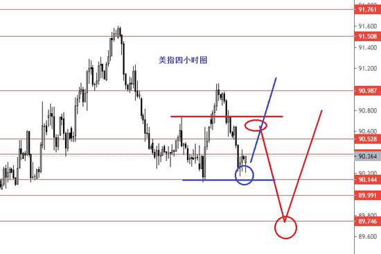美指上周区间震荡,收盘偏低。从图形来看,未来后市波段主方向还是两手准备,要么继续震荡向上反弹,也只是反弹,反弹后再说下一步;要么低位区间震荡后下跌。本周美指按区间震荡格局操作,下方重点关注89.75/89.60区域,上方关注91整数关口。今日只有大概思路,没有具体操作建议,红线概率较大些,蓝线备选方案。