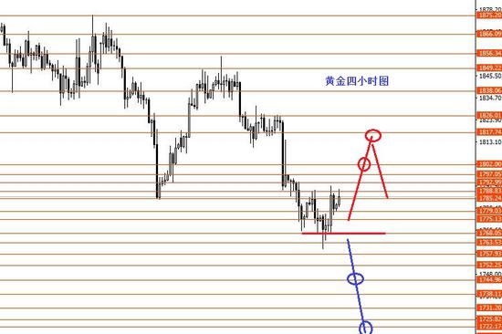 黄金上周正如预期,下跌行情到达1768区域。从图形来看,黄金本周区间震荡的概率相对较大些,所以 本周以短线为主,然后等待月线收盘后,再做下一步打算。既然是短线,就得相对较灵活。周初先关注 1768/1763区域强支撑,在1763没成功跌破前,黄金震荡向上修整的概率相对较大些,上方则关注1802和 1817强阻力,重点关注1802先。本周有可能冲高回落,也有可能冲高后不回落,周图收个小阳柱。若周 初日线直接收至1768下方再追空也不迟,这是备选方案。今日只有大概思路,没有具体操作建议,保守 者可以先观望,区间震荡短线,空间也不大,对建仓点位要求也较高,建仓点没找好,止损摆小了也很 容易损,止损摆大了损盈比不划算。