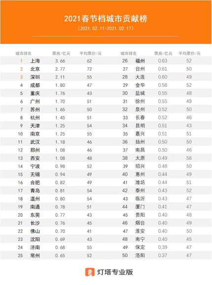 像李晓这样就地过年的人不在少数。据央视新闻报道,2021年全国有超过1亿人“就地过年”。据灯塔专业版统计,2012春节档城市贡献榜(2月11日-17日)中,上海、北京和深圳分别以3.66亿元、2.77亿元和2.11亿元位列前三,平均票价分别为62元、72元和55元;成都和重庆以1.8亿元和1.76亿元紧随其后。