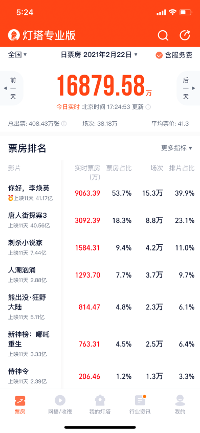 国家电影局2月18日中午发布的数据显示,2021年2月11日除夕至17日正月初六,全国电影票房达78.22亿元,继2019年59.05亿元后,再次刷新春节档全国电影票房纪录。同时,也创造了全球单一市场单日票房、全球单一市场周末票房等多项世界纪录。