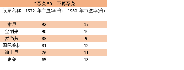 利率的快速抬升首先冲击的就是当时估值已经非常高的“漂亮50”标的。1972年,“漂亮50”的PE中值为42X,远高于同期标普500的19X,而1974年末“漂亮 50”的PE估值下行至17X。