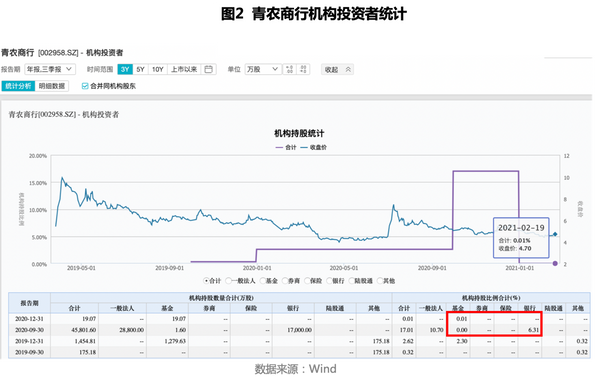 同时,也有人提议引入机构投资者,“相对个人投资者而言,投资机构者资金量大,由投资领域的专家进行专职投资管理和运作,善于发掘并长期持有优质公司股票,通常情况下,不会像散户一样频繁买卖操作,有利于股价稳定。” 前银行从业人士、亿海投资CEO吴洪君向《投资者网》分析道。然而,就目前而言,青农商行的机构投资者持股占比几乎为零,其中银行在第三季度报表中持有的6.31%股份,也已经在2020年第四季度“清仓”(见图2)。