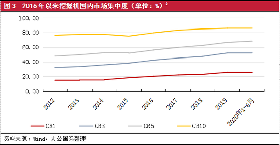 2020年以来,行业的集中度继续保持提升趋势,头部企业仍保持较大的领先优势。工程机械行业在经历了2011~2015年的低迷行情后,规模效益低下、资金及技术实力较差的劣势厂商逐步退出,行业的集中度呈不断提升的趋势。以挖掘机为例,2015年以来,在三一、徐工等国产品牌的市场份额增长推动下,行业集中度波动提升,其中三一稳居行业第一、徐工于2019年超越卡特彼勒后维持在行业第二。2020年上半年,行业第一和行业前三市场占有率分别稳定在25%以上和约52%,其中行业第一相较第二位仍保持较大的领先优势;行业前五合计市场占有率出现一定的提升。预计2021年,行业格局继续保持集中度提升趋势,行业头部企业市场地位将进一步巩固。