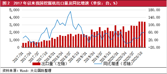 海外市场方面,随着技术水平和产品质量提升,我国国产工程机械设备2017年以来出口规模增长明显。以挖掘机为例,2017~2019年,我国出口挖掘机数量同比增速分别为32.00%、97.48%和39.35%。2020年1~11月,我国出口挖掘机3.05万台,同比增长28.82%,其中3~6月,受新冠疫情蔓延影响,海外市场需求明显收缩,出口同比增速大幅下滑;受益于海外经济有所复苏及国内产能恢复快于海外产能,7月以来我国挖掘机出口同比增速出现快速回升。目前,国内工程机械产业链产能恢复良好,同时伴随疫苗的推出,海外新冠疫情预计将逐渐缓解,经济也将逐步复苏,预计2021年出口需求将继续增长。
