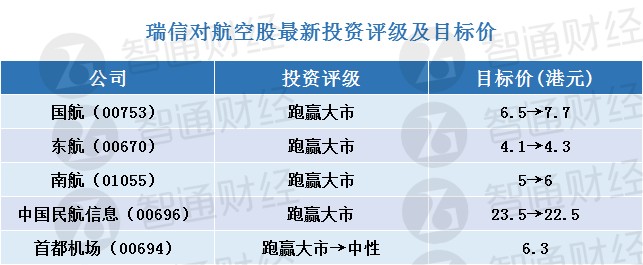 瑞信:维持航空行业正面看法 更新航空股评级及目标价