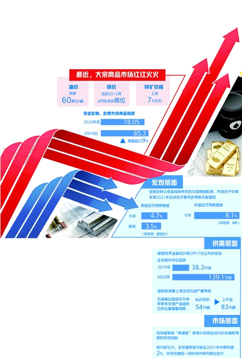最近,大宗商品市场红红火火:油价突破60美元/桶,铜价达到2012年4月以来的高位,锌矿价格也上涨了7%左右。受此影响,彭博大宗商品指数从2020年底的78.05上升至2月19日的85.3,增幅超过9%,不仅从去年4月份58.87的谷底强势反弹,而且超出了2019年底的水平。