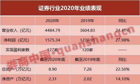 中证协数据显示,过去一年证券行业业绩保持增长,资产规模稳步提升,共有127家证券公司实现盈利。其中,证券公司共实现营业收入4484.79亿元,相比于2019年的3604.83亿元,同比增长24.41%;实现净利润1575.34亿元,相比于2019年的1230.95亿元,同比增长27.98%。
