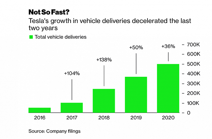 2020年,特斯拉在全球交付了近50万辆汽车,比2019年增长了36%,并公开预测未来几年“年均增长50%”。