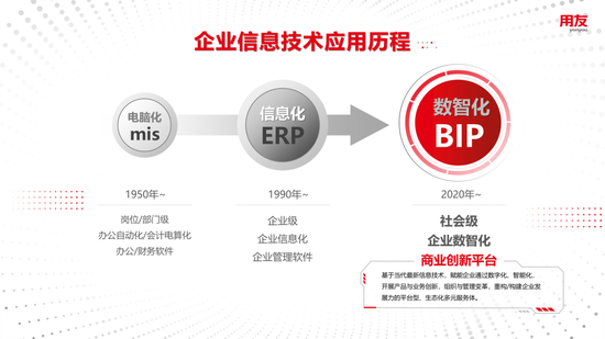 今天已经进入第三个阶段,就是刚才讲到的数智化阶段,上一代是一个系统,这一代光是系统解决不了今天企业的要求,它应该是一个平台,我们叫做商业创新平(BIP)。