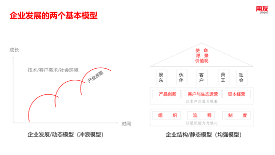 下面这两个模型,是我自己十几年前整理的企业发展的框架模型:一个叫企业发展模型或动态模型,是放在时间轴的角度来看企业的发展,动态地去看;第二个模型是结构性模型,是一个静态模型,把一个企业组织剖开,看它里面到底是什么样的要素和结构。