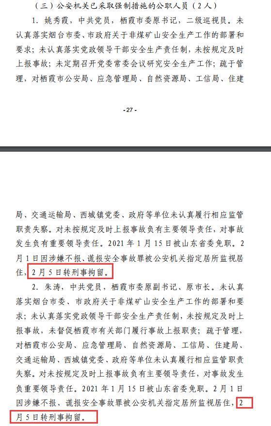 2.朱涛,中共党员,栖霞市委原副书记、原市长。未认真落实烟台市委、市政府关于非煤矿山安全生产工作的部署和要求;未认真落实党政领导干部安全生产责任制,未按规定及时上报事故,未督促栖霞市有关部门履行事故上报职责;疏于管理,对栖霞市公安局、应急管理局、自然资源局、工信局、住建局、交通运输局、西城镇党委、政府等单位未认真履行相应监管职责失察。对未按规定及时上报事故负有主要领导责任,对事故发生负重要领导责任。2021 年1月15日被山东省委免职。2月1日因涉嫌不报、谎报安全事故罪被公安机关指定居所监视居住,2月5日转刑事拘留。