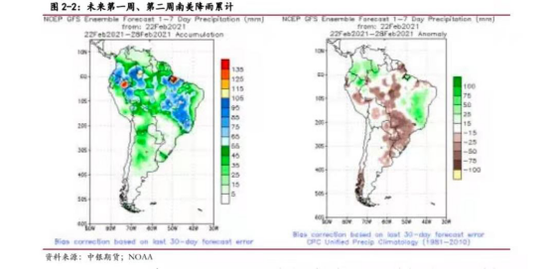 豆粕期价先前的那波回调主要是受到天气状况的影响,南美、阿根廷有力持续的降雨提高了大豆产量的供应前景,也降温了豆粕盘面火热的走势。不过回到当下节点,南美,巴西,阿根廷的降雨出现了一定程度的缓解,或助导豆粕期价重新回到有利地位。具体来看,最新天气情况根据 NOAA报道,未来第一周 (2月 22-28 日),巴西降雨主要集中在 MATOPIBA地区(马拉尼昂、托坎丁斯、皮奥伊州和巴伊亚州的交界处),也就是该国东部偏南部地区,局部地区累计降雨量可达100毫米,主产区从马托格罗索部分地区降雨量也比较大但整体小于前几周的水平,而从南马托格罗索和戈亚斯到南部地区(包括南里奥格兰德州、圣卡塔琳娜州和巴拉那州)则出现了大范围的干燥,这将有利于当地农户推进大豆收获。阿根廷西北部地区预计会出现几场阵雨,近几周持续的干燥有利于早熟作物的收获,但也引发了对未成熟玉米和大豆作物生长的担忧。未来第二周(3月1-7日),巴西全国大部分地区都会出现降雨,降雨主要集中在中部和北部地区,或再次影响大豆收获的推进。阿根廷中部及北部地区预报有阵雨,相对于之前降雨的程度,目前已经有了很大的缓解,或在一定程度上促进豆市价格重心的回暖。