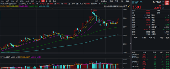 豆粕期货在经历了大概一个月左右的慢慢下跌后,近来似乎有了些蓄势待发的苗头。从2月23日尾盘发力形成的大阳线来看,大有平台突破的走势。随着当前市场化工板块上升步伐的短暂缓解,短期期指、股指风险偏好上抬,回调压力加大,大环境下,豆粕作为农产品的避险属性正在逐步凸显。那么,豆粕期价后市能否以此为发力点向上突破,走出一波漂亮行情呢?短期来看,豆粕期货内在基本面又是怎样一个情况呢?截至2020年2月24日收盘,豆粕期货主力05合约报在3591元,涨幅1.81%。