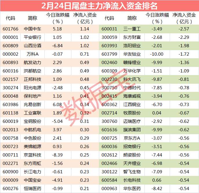 从个股尾盘资金流向数据看,有4股尾盘净流入资金超过5000万元,中国中车、平安银行、山西汾酒等个股尾盘资金净流入金额最多,分别高达1.4亿元、1.02亿元、1.02亿元;三一重工、东方财富和洛阳钼业等个股尾盘资金净流出金额最多。