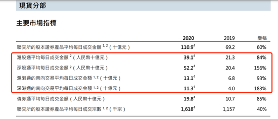 公司强劲的财务表现同样反应了过去一年港股市场的韧性和活跃性。现货市场2020年全年平均每日成交额达1295亿港元,同比增加49%,其中多日录得单日成交额逾2000亿港元,2020年全年市场总成交额创32.1万亿港元新高,同比增加50%,证券市场市值于2020年12月底达47.5亿港元,同比增加25%。